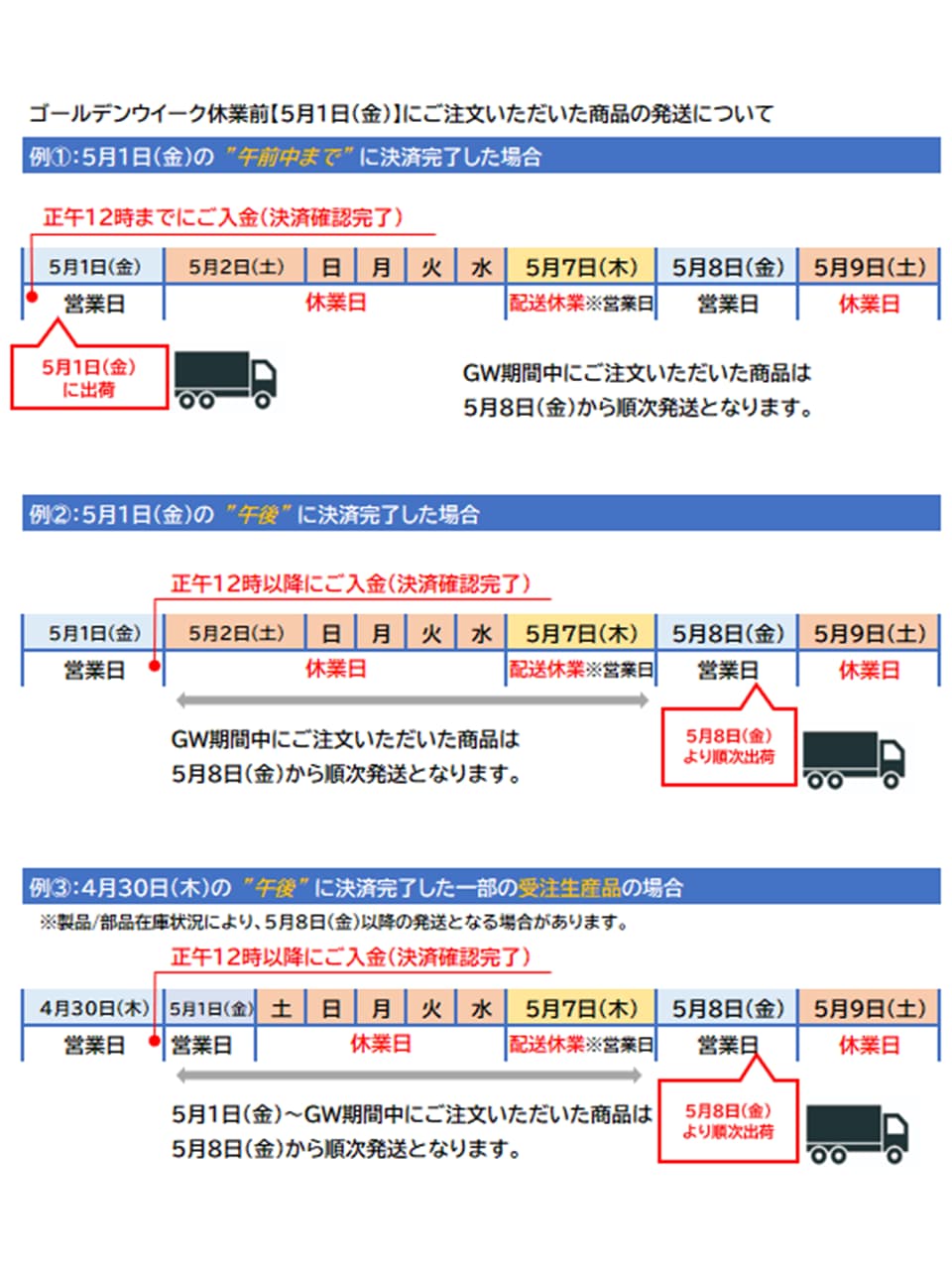 ①5月1日(金)昼12:00までにご注文・決済確認完了した商品は当日の出荷となります。